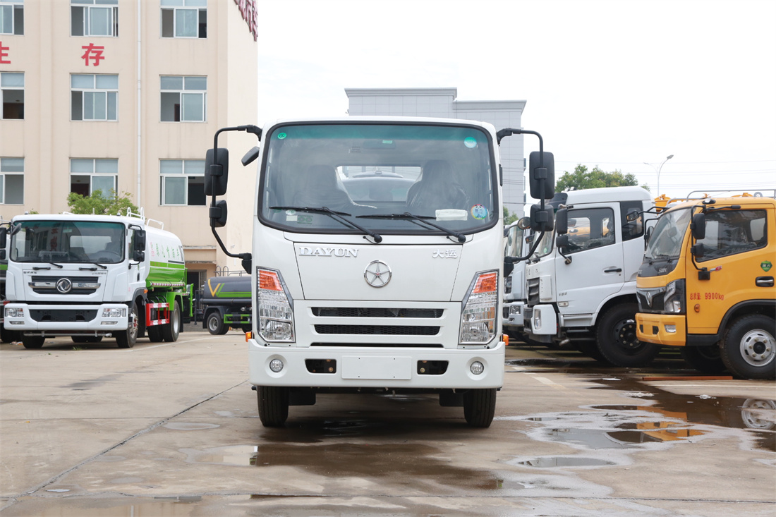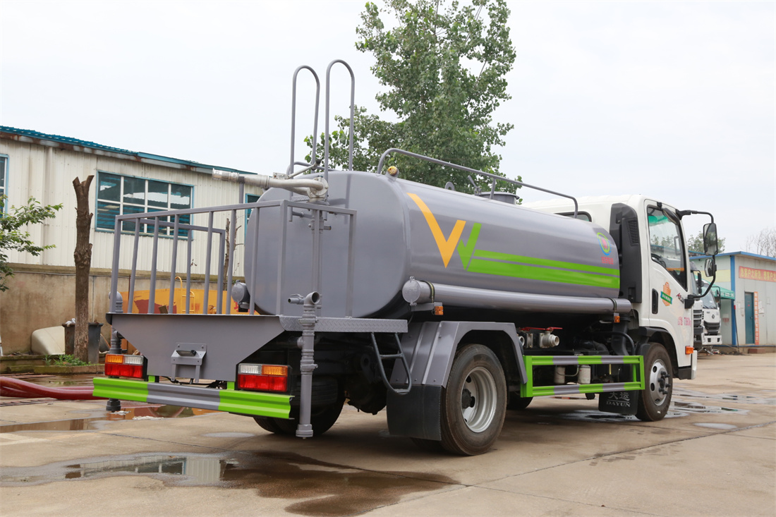 灑水車(chē)前裝有鴨形噴嘴或圓頭沖嘴,后面裝有圓柱開(kāi)灑水噴嘴或蓮蓬頭噴嘴,后部有一工作平臺(tái),裝配有水炮。后部還可裝8個(gè)噴嘴(選裝)。