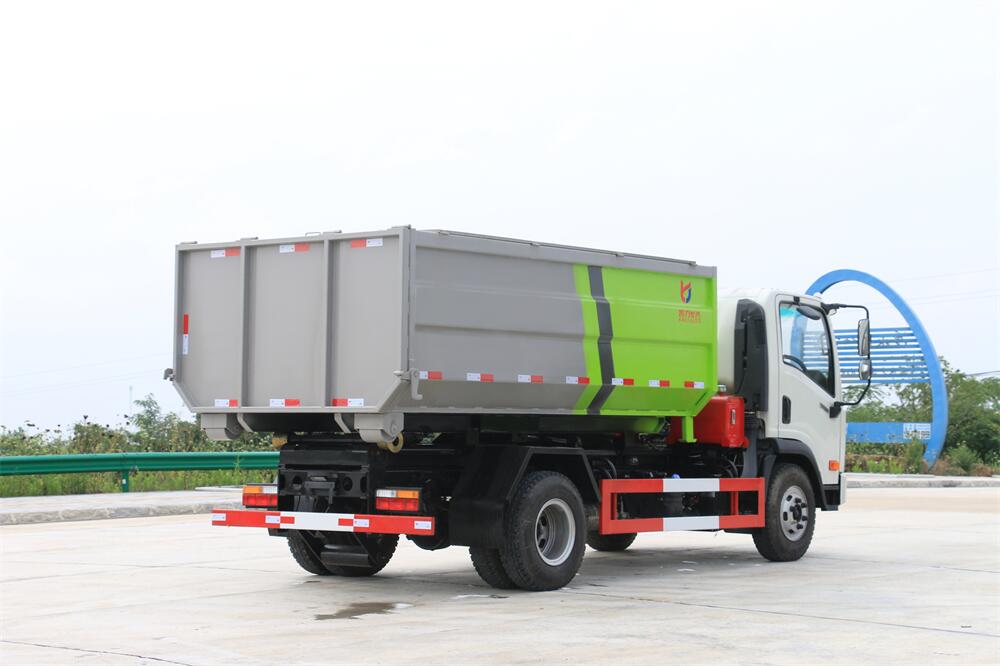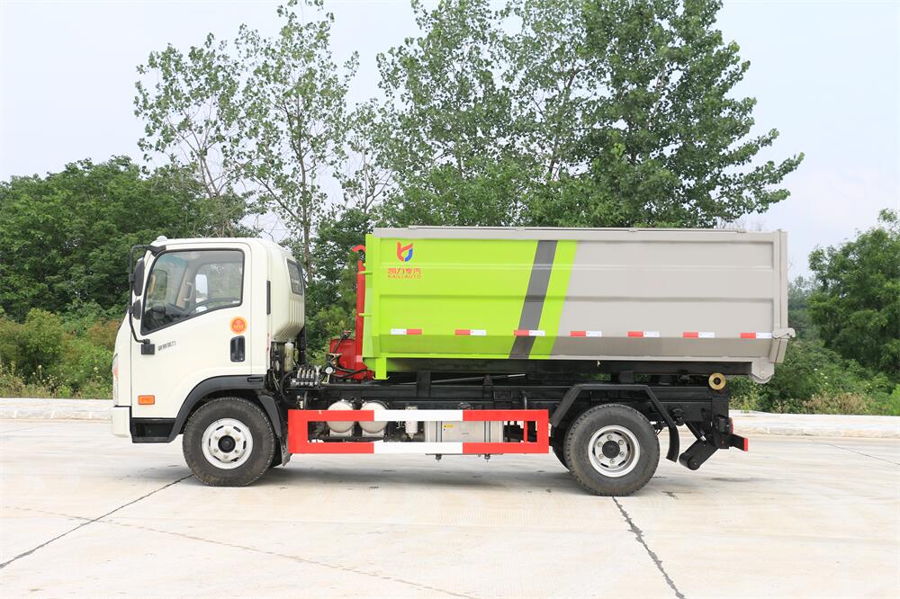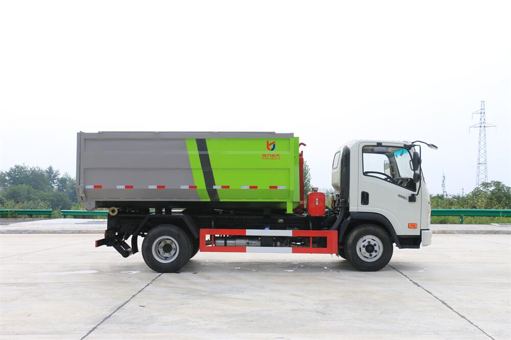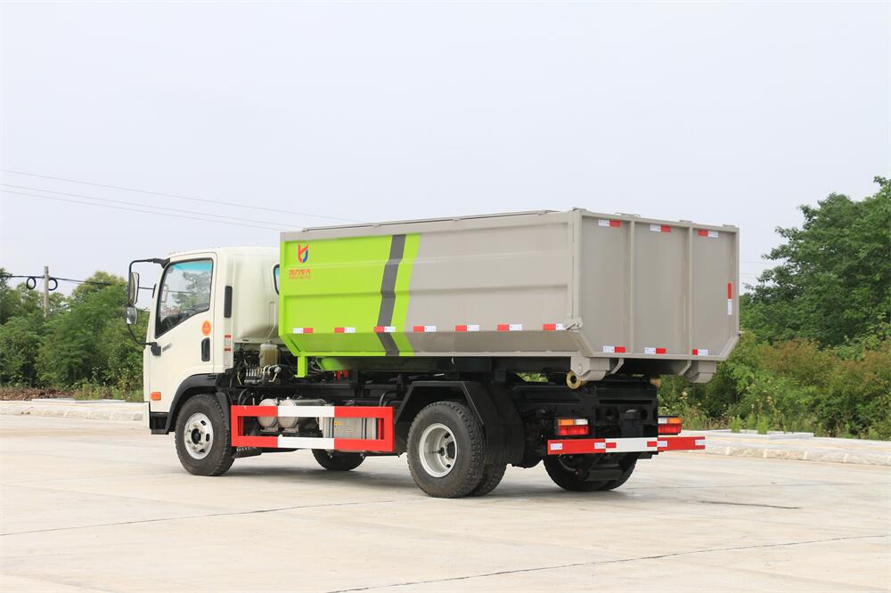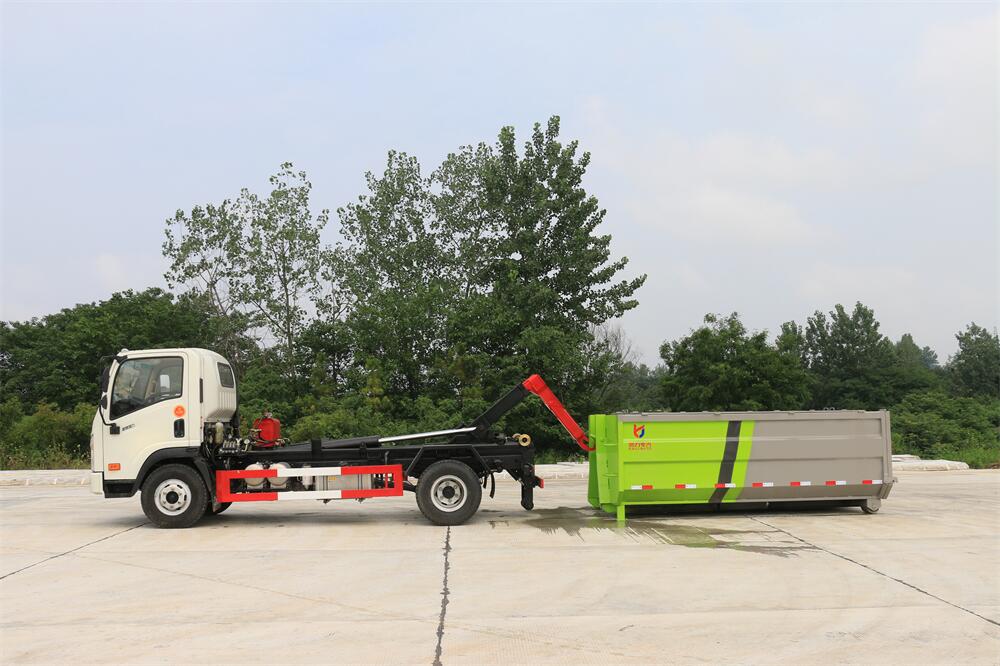 勾臂式垃圾車(車廂可卸式垃圾車)介紹: 車廂可卸式垃圾車又叫拉臂式垃圾車,是一種采用高新設(shè)計(jì)可伸縮的鉤臂,實(shí)現(xiàn)垃圾廂的二次吊裝,自吊上放下,可自行傾倒垃圾的環(huán)衛(wèi)設(shè)備。 拉臂式垃圾車結(jié)構(gòu)簡單,操作穩(wěn)定方便,裝卸效率高,機(jī)械化程度高,節(jié)省人力。鉤臂垃圾車一車可帶多個垃圾廂,在裝卸的運(yùn)輸過程中可有效地避免二次污染。 拉臂垃圾車采用高新設(shè)計(jì)可擺動的鉤臂,垃圾箱由框架、開啟油缸、滑輪、后門和若干加強(qiáng)框架與鋼板焊接而成。調(diào)換貨廂快捷方便,貨廂上帶蓋(倒垃圾時可翻開),鉤臂垃圾車?yán)鴰w可選用碳鋼、不銹鋼材質(zhì)、內(nèi)部采取環(huán)氧樹脂防腐處理,改裝部分與原車底盤為可分離式,維修方便且保持了原車的機(jī)動性及行駛性能。