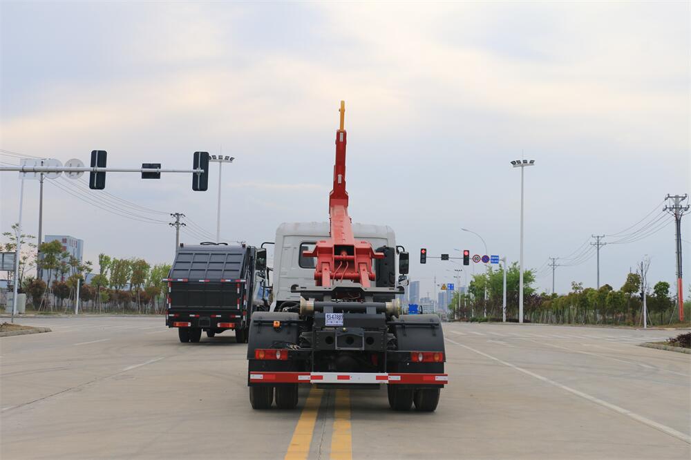 該款鉤臂式垃圾車(chē)由液壓系統(tǒng)、操作系統(tǒng)組成。舉升油制缸(1支)系國(guó)內(nèi)知名液壓件廠家生產(chǎn)的雙作用油缸。垃圾廂可自吊上放下,可自行傾倒垃圾,上下一次工作循環(huán)時(shí)間≤50S。該車(chē)的特點(diǎn)是一個(gè)車(chē)能配多個(gè)垃圾廂,能實(shí)現(xiàn)一臺(tái)車(chē)與多個(gè)垃圾廂聯(lián)合作業(yè),循環(huán)運(yùn)輸,充分提高了車(chē)輛的運(yùn)輸能力。