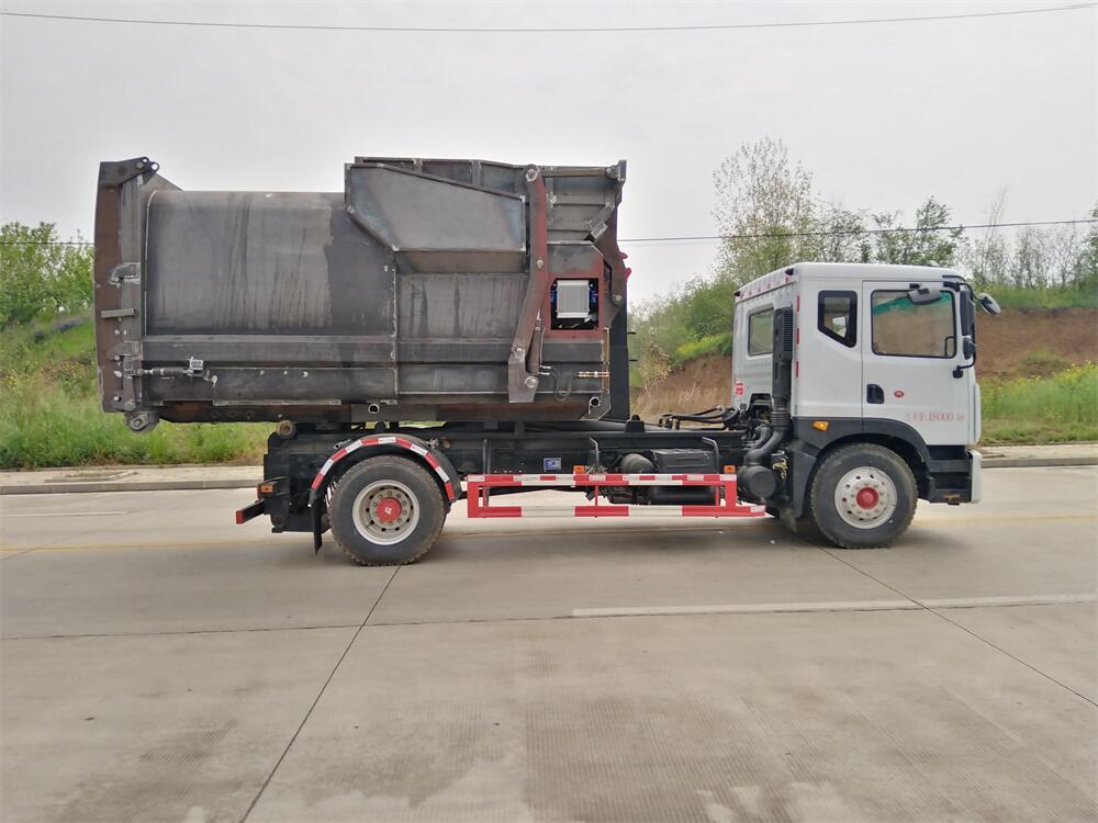 該款鉤臂式垃圾車由液壓系統、操作系統組成。舉升油制缸(1支)系國內知名液壓件廠家生產的雙作用油缸。垃圾廂可自吊上放下,可自行傾倒垃圾,上下一次工作循環時間≤50S。該車的特點是一個車能配多個垃圾廂,能實現一臺車與多個垃圾廂聯合作業,循環運輸,充分提高了車輛的運輸能力。