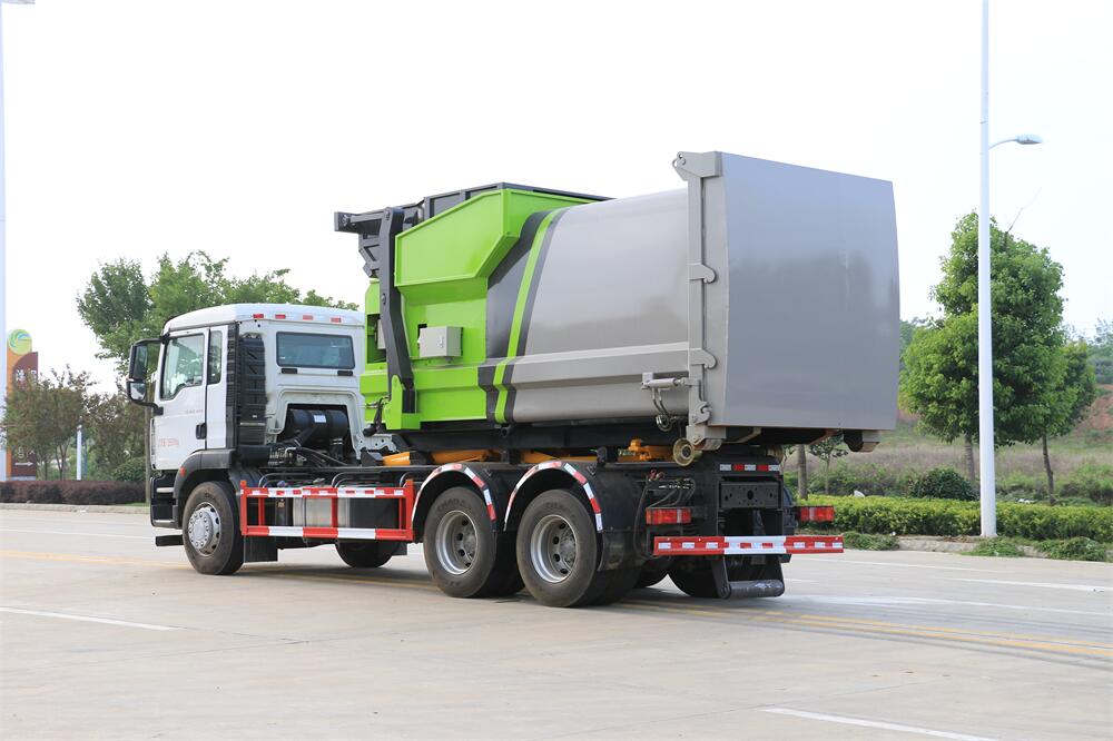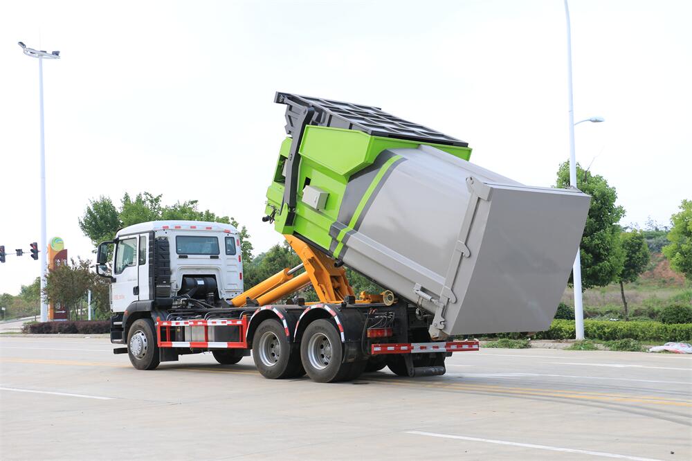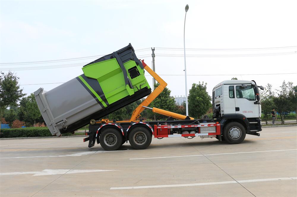 勾臂式垃圾車(車廂可卸式垃圾車)介紹: 車廂可卸式垃圾車又叫拉臂式垃圾車,是一種采用高新設計可伸縮的鉤臂,實現垃圾廂的二次吊裝,自吊上放下,可自行傾倒垃圾的環衛設備。 拉臂式垃圾車結構簡單,操作穩定方便,裝卸效率高,機械化程度高,節省人力。鉤臂垃圾車一車可帶多個垃圾廂,在裝卸的運輸過程中可有效地避免二次污染。 拉臂垃圾車采用高新設計可擺動的鉤臂,垃圾箱由框架、開啟油缸、滑輪、后門和若干加強框架與鋼板焊接而成。調換貨廂快捷方便,貨廂上帶蓋(倒垃圾時可翻開),鉤臂垃圾車垃圾廂體可選用碳鋼、不銹鋼材質、內部采取環氧樹脂防腐處理,改裝部分與原車底盤為可分離式,維修方便且保持了原車的機動性及行駛性能。