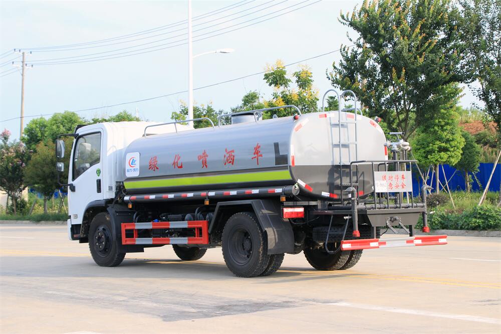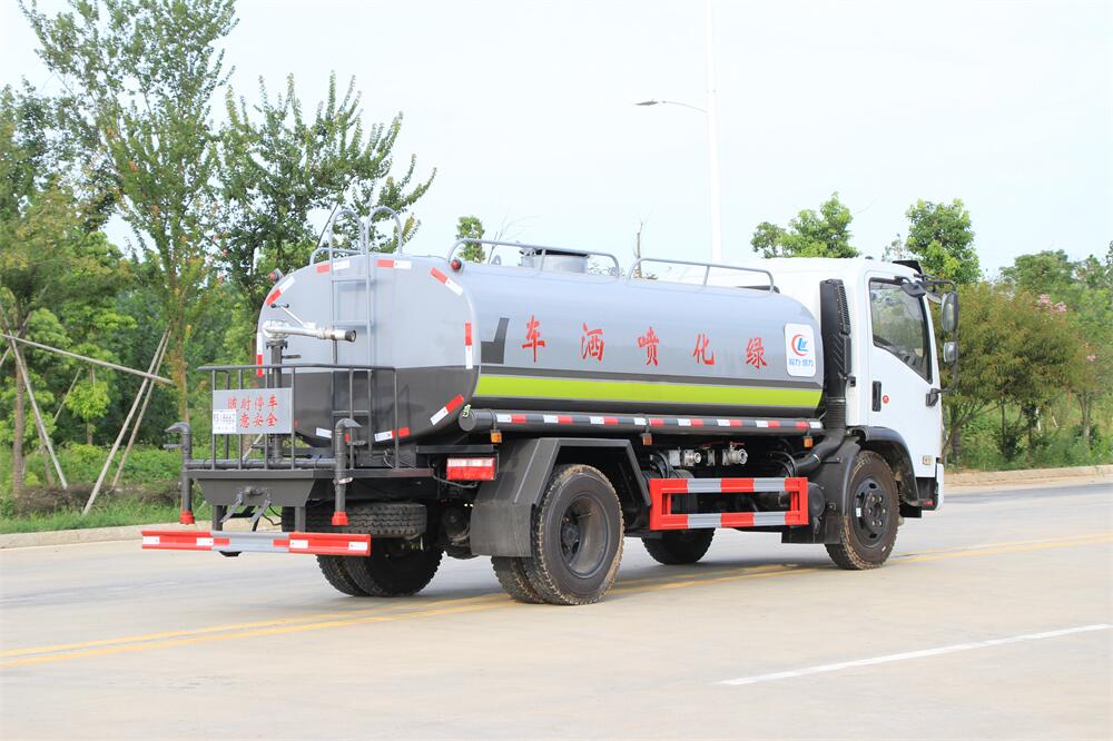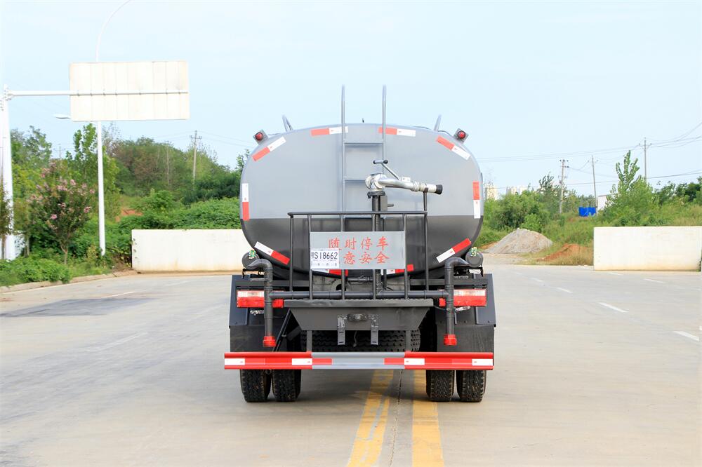 灑水車(chē)前裝有鴨形噴嘴或圓頭沖嘴,后面裝有圓柱開(kāi)灑水噴嘴或蓮蓬頭噴嘴,后部有一工作平臺(tái),裝配有水炮。后部還可裝8個(gè)噴嘴(選裝)。