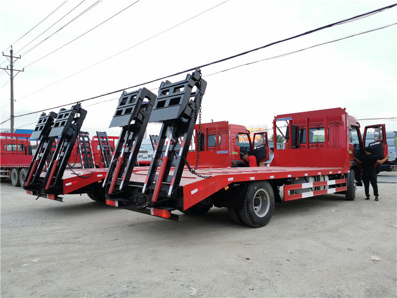 解放龍V單橋平板運輸車 一汽青島駕駛室 排放:國五新規 發動機:錫柴180馬力 變速箱:陜齒8檔 前后橋:145后橋 可選軸距:5米軸距 輪胎:900-20鋼絲胎 大梁: 250雙大梁 整車對應尺寸:9000*2500*2900 車型亮點:ABS防抱死系統 . 剎車間隙自動調整臂、防飛濺、中控鎖,遙控鑰匙,電動門窗,鋁合金油箱。 上裝采用五毫米花紋鋼板,100*100方鋼做橫梁,加強雙簧爬梯,可拉15噸以下挖機。 可選裝配置:液壓全自動爬梯,折疊型加長型液壓全自動爬梯,可加裝兩邊伸展,一邊可伸縮30公分。